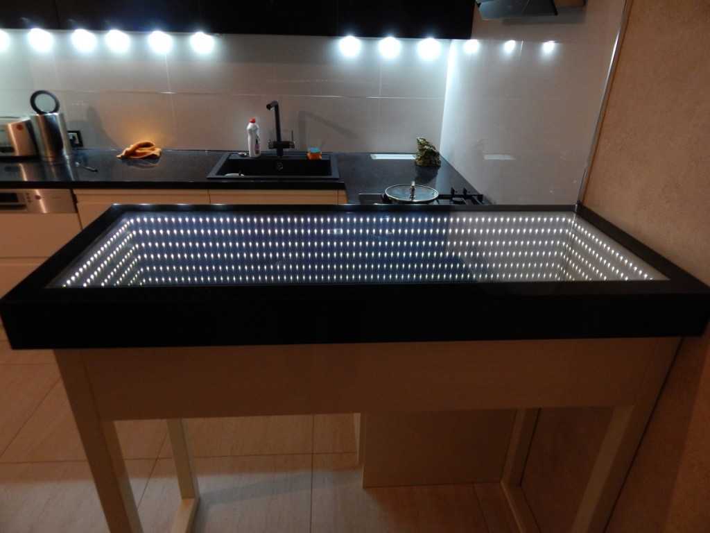 Стол с бесконечным зеркалом способен придать ультрасовременный облик любому интерьеру. Он удачно впишется в футуристический дизайн, где приветствуются новейшие технологии и материалы. Существует несколько вариантов подсветки зеркальных столов.