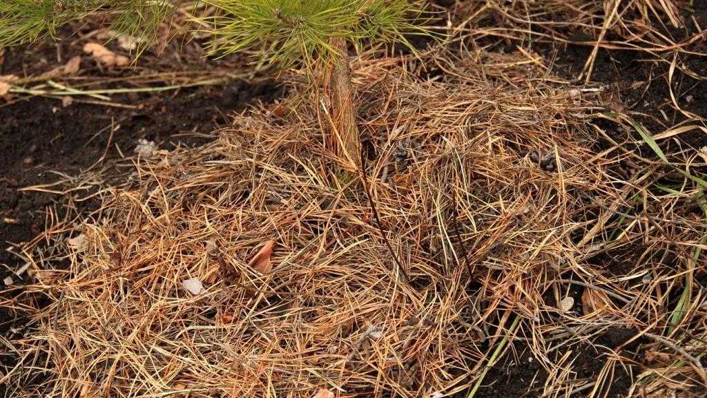 После посадки замульчируем землю вокруг ствола. Мульча, как вам наверняка известно, помогает сохранять влагу, предотвращает прорастание сорняков и, медленно перегнивая, работает как мягкое удобрение. Мы для мульчирования набрали опавших сосновых иголок.