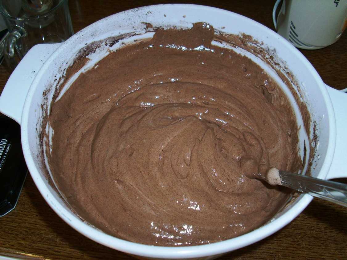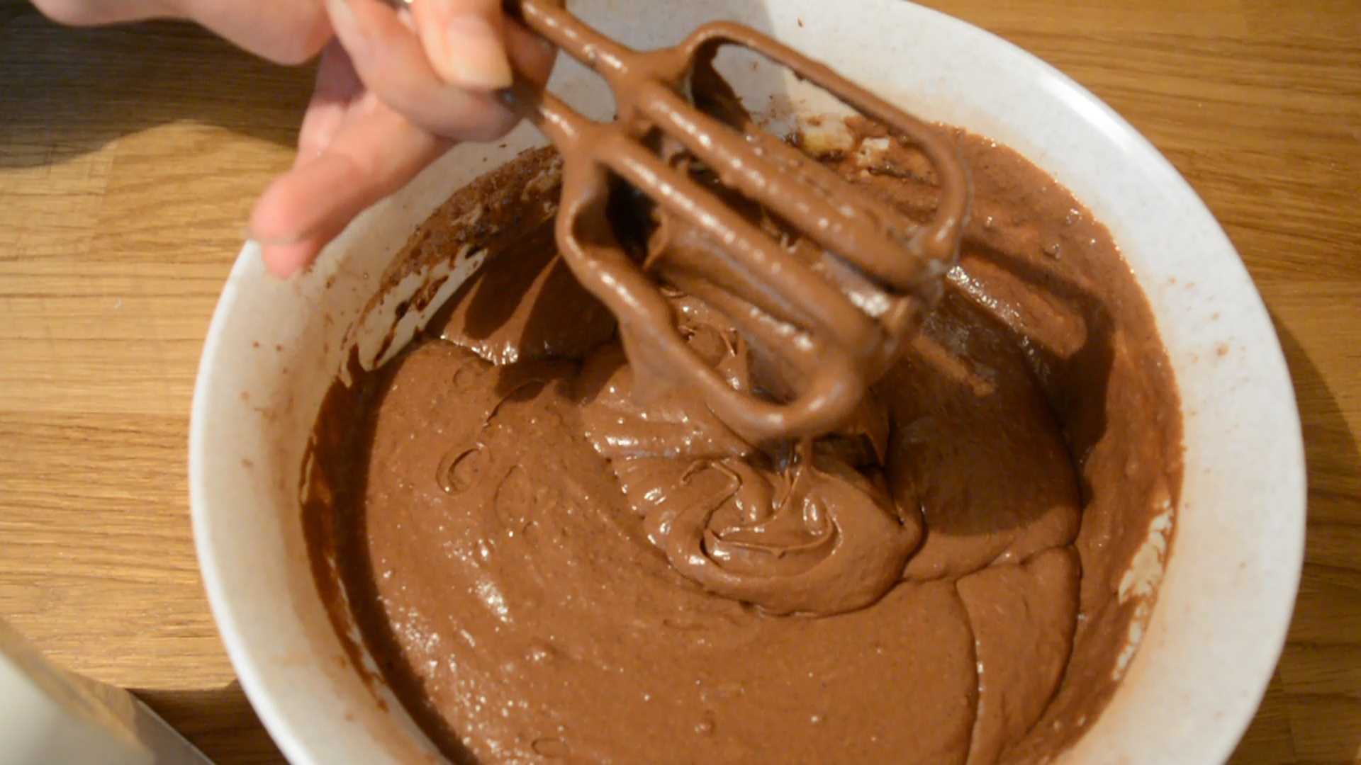 6. Вмешайте оставшиеся белки, добавляя по одной трети за раз, пока масса не станет равномерного шоколадного цвета, без следов белка. Не перемешивайте больше, чем необходимо!