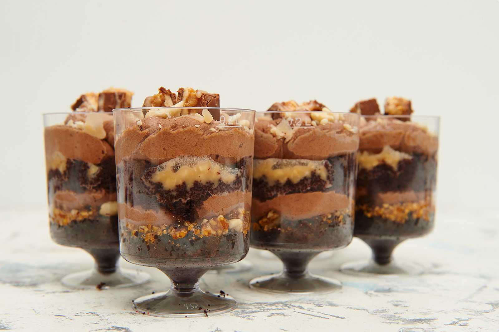 Слои трайфла могут быть из желе и мусса. Фантазируют любители десертов в стаканчиках, каждый по-своему, используя белый шоколад, темный, простой порошок какао и желатин, если хотят стабилизировать слои быстрее.