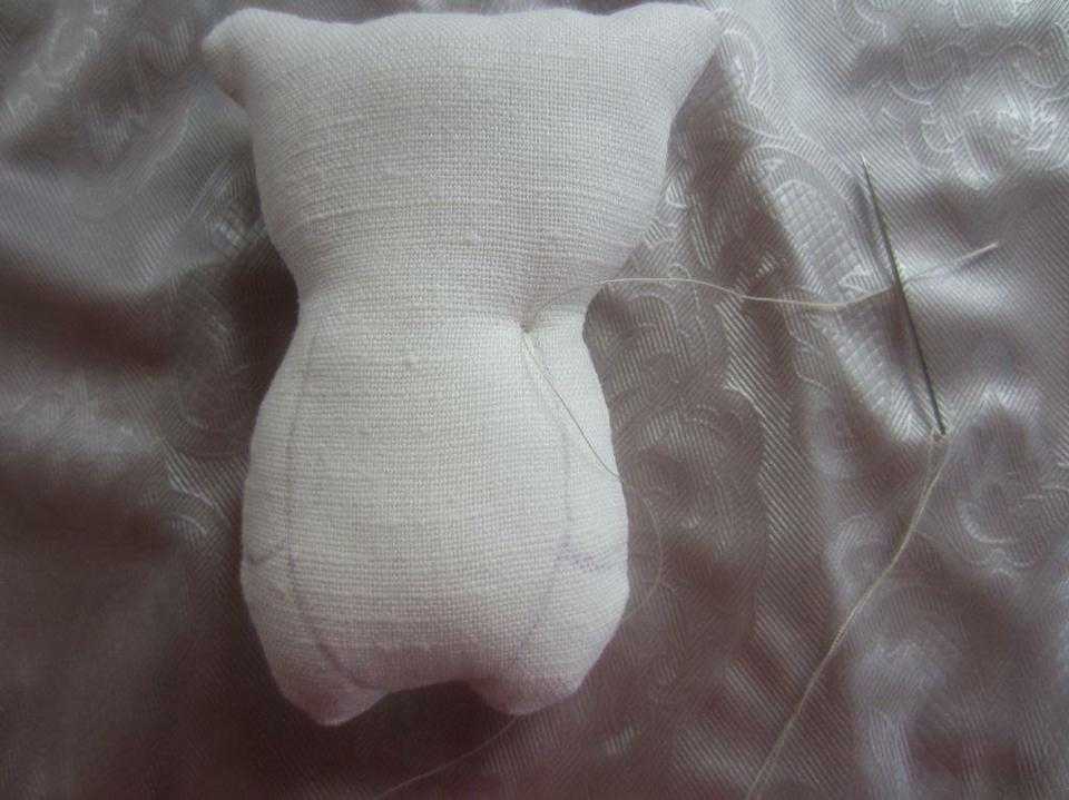 Сложите бязь вдвое, перенесите на нее выкройку медвежонка и аккуратно вырежьте, оставляя не менее 0,5 см на припуски. И прошейте заготовку по контуру, оставив снизу между лапками отверстие для выворачивания изделия. В выпуклых местах делаем надрезы припусков как на фото.