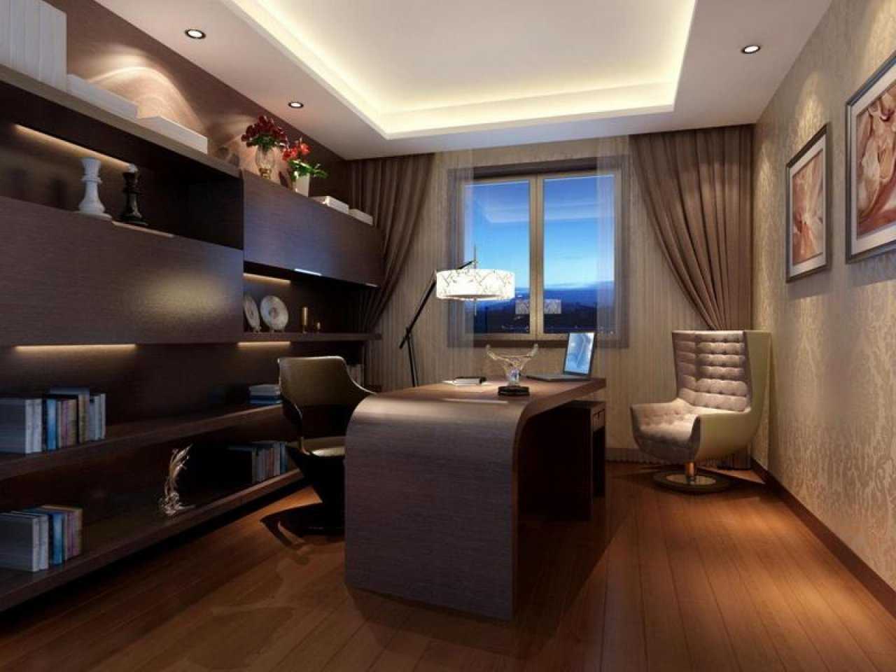Главное условие – хорошая освещенность рабочего стола, за которым занятые люди проводят целые дни. Это оказывает непосредственное влияние на их эффективность, предотвращает утомляемость, сохраняет здоровье глаз. Верхний свет не настолько важен. Он может быть рассеянным и ненавязчивым. В кабинете не нужны дворцовые люстры, достаточно встроенных устройств и настольной лампы с гибкой или складной ногой.