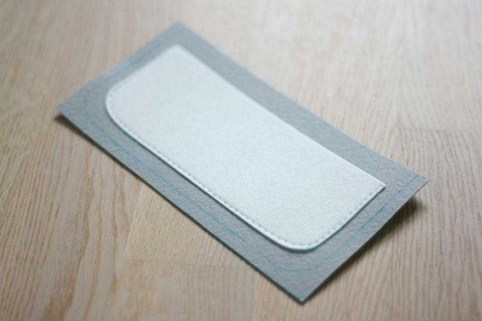 После сшивания накидной детали кошелька примеряем его к основной детали для обозначения места второй части кнопки. Ее лучше прикрепить не к самому карману, а на отдельный квадрат фетра, пришитый к нему. На данный квадрат мы присоединяем часть с пазом тем же способом, каким присоединяли первую часть кнопки.