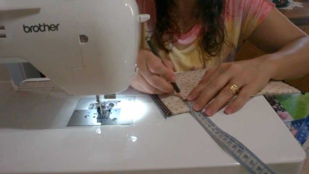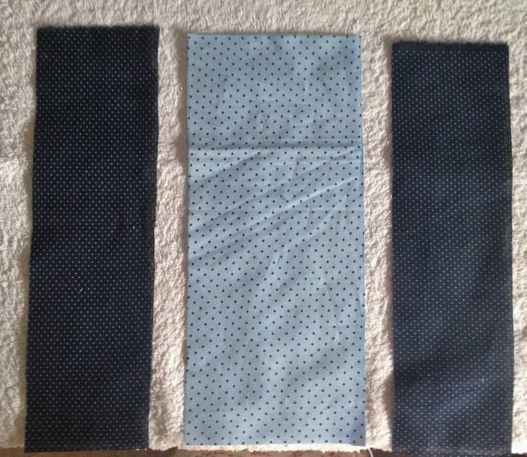 Начнем с выкройки: вырезаем ткань по указанным размерам. У нас получилось 3 полоски: 26/8 см, 26/10 см, 26/8 см. Их нужно сшить, складывая прямо внутрь.