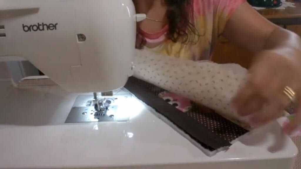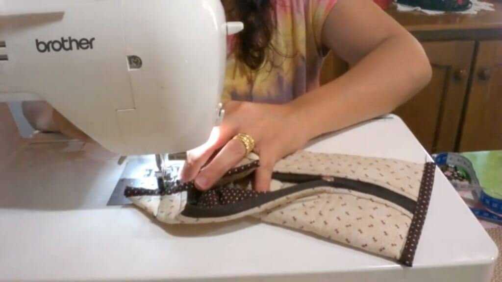 Для отделки вырезаем 2 «язычка» по 6/10 см. Сшиваем их по длине, переворачиваем и вставляем по центру с одной и другой стороны. «Хвостик» должен выступать на 1 см. Режем булавками.