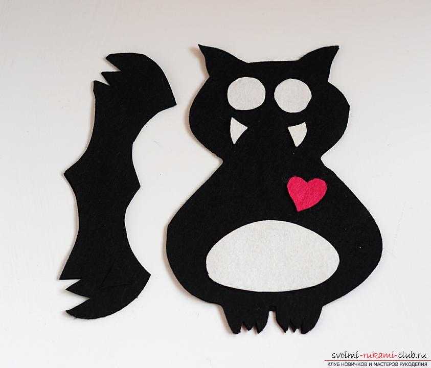 Учтите тот факт, что пузико, детали мордочки и сердца следует выкраивать из фетра других расцветок. Не следует также забывать и о припусках на швы.
