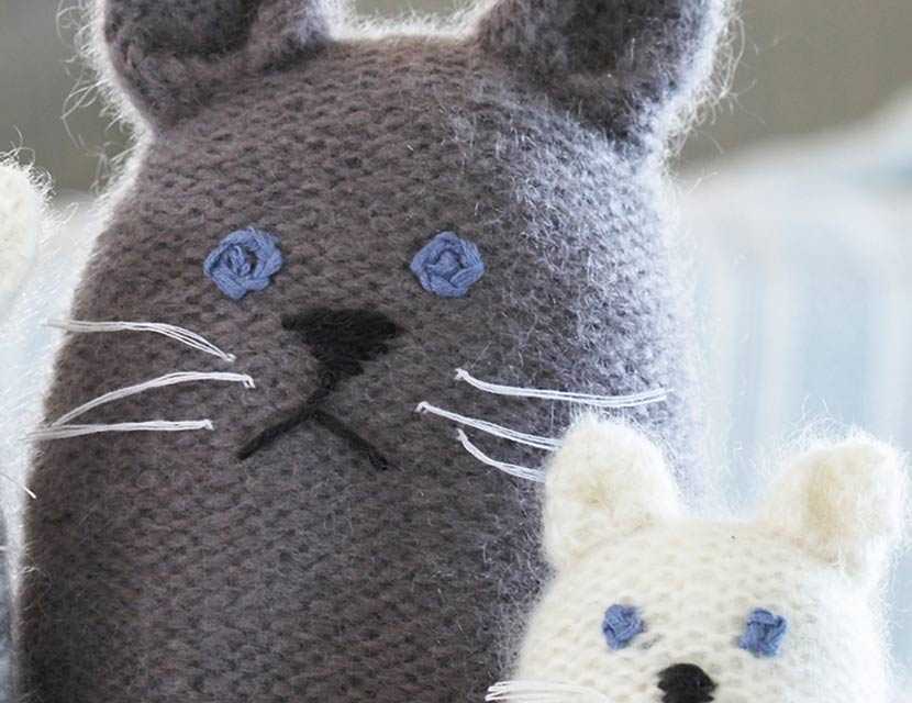 - Домашние питомцы: собаки, кошки, зайчики. Вяжутся они по тем же основам, как и предыдущие вариации, но отличаются более сложным исполнением. Для красоты можно дополнить лапки или внутреннюю сторону ушей тканью, прошить усики и приклеить большие бусины-глаза.