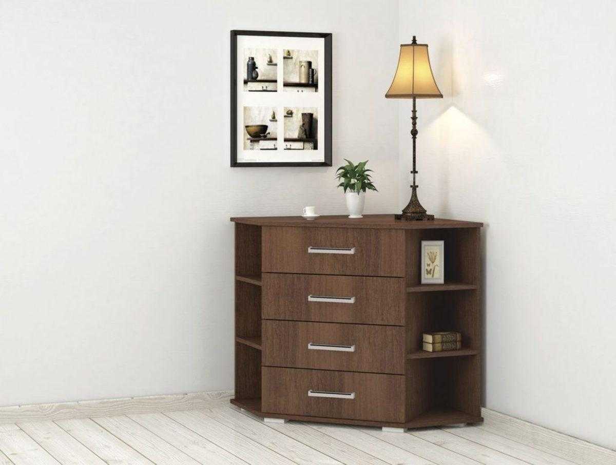 Угловой комод или тумба – идеальный подходит для небольшой гостиной. Комод позволит сэкономить полезную площадь комнаты, занимая угол зала, позволяет вместить массу вещей в выдвижных ящиках, а верхнюю плоскость, использовать как подставку. Угловые комоды невысокие, не более 1 м.