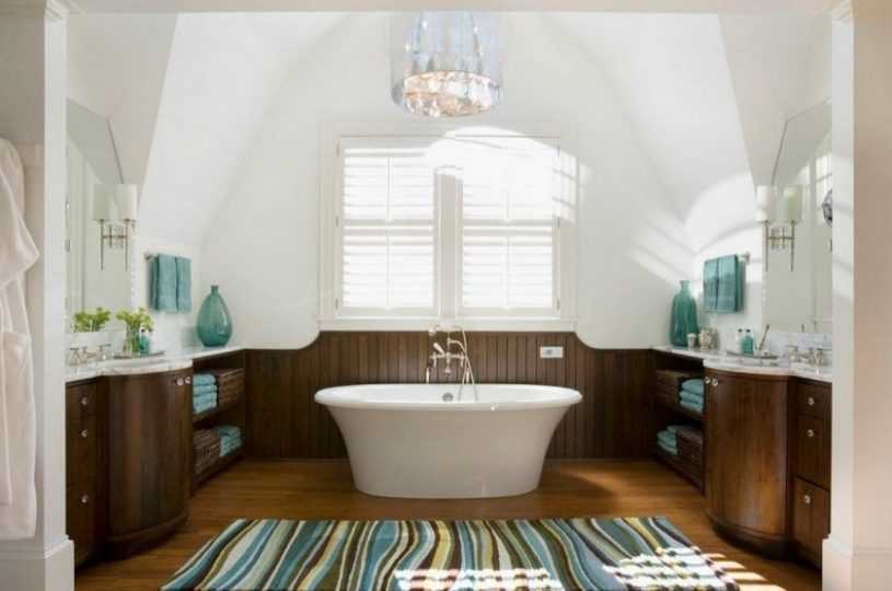 - Желательно, чтобы форма коврика повторяла основные линии, преобладающие в комнате. При наличии овальной ванной, раковины или декора на потолке и коврик нужно подобрать закругленной формы. Если в комнате много тумбочек, полочек и шкафчиков, подчеркнуть ровные линии их контуров можно с помощью прямоугольного половичка.