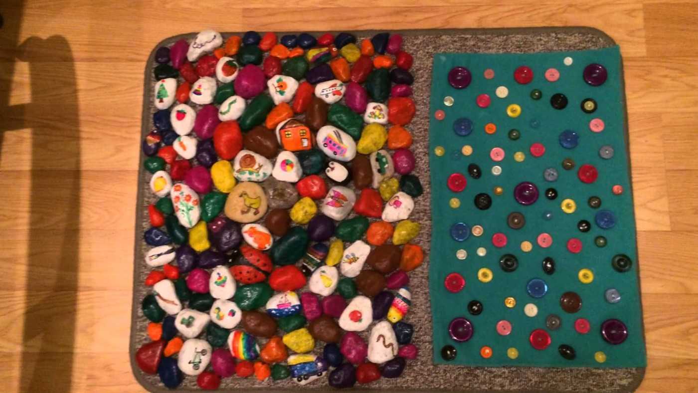 Вязаный коврик в виде гальки и пуговец – оригинальный вариант для ванной комнаты.