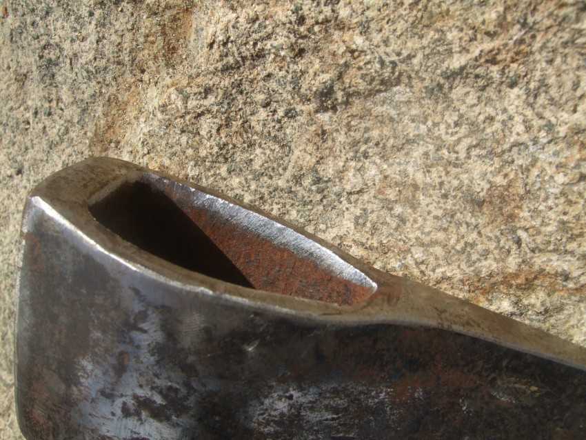 Горячий металл ведет себя как нагретый в руках пластилин. Когда появилась опасность упереться зубилом в наковальню, совместил проушину с отверстием наковальни и зубило провалилось в проушину. Следующее действие – увеличить отверстие. Для этого нужен ригель. Он был сделан из болта. Полученный таким образом ригель не очень прочный, но на сотню томагавков его хватит. Ему была придана форма конуса и инструмент был отшлифован на станке. С помощью большого молота была окончательно разогнана шляпка костыля в будущее лезвие томагавка. На следующий день из подручных средств были изготовлены кузнечные клещи с угловыми губками. Такое приспособление отлично удерживает костыль. Ударная поверхность молота близка к сферической, она позволяет оставлять на поверхности деталей максимально большие вмятины.