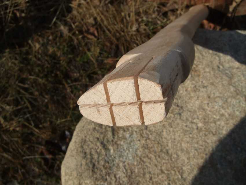 - Головка топорища подгоняется под размеры отверстия в клинке. Для этого понадобится пила и наждачка. Сложного в этом ничего нет.