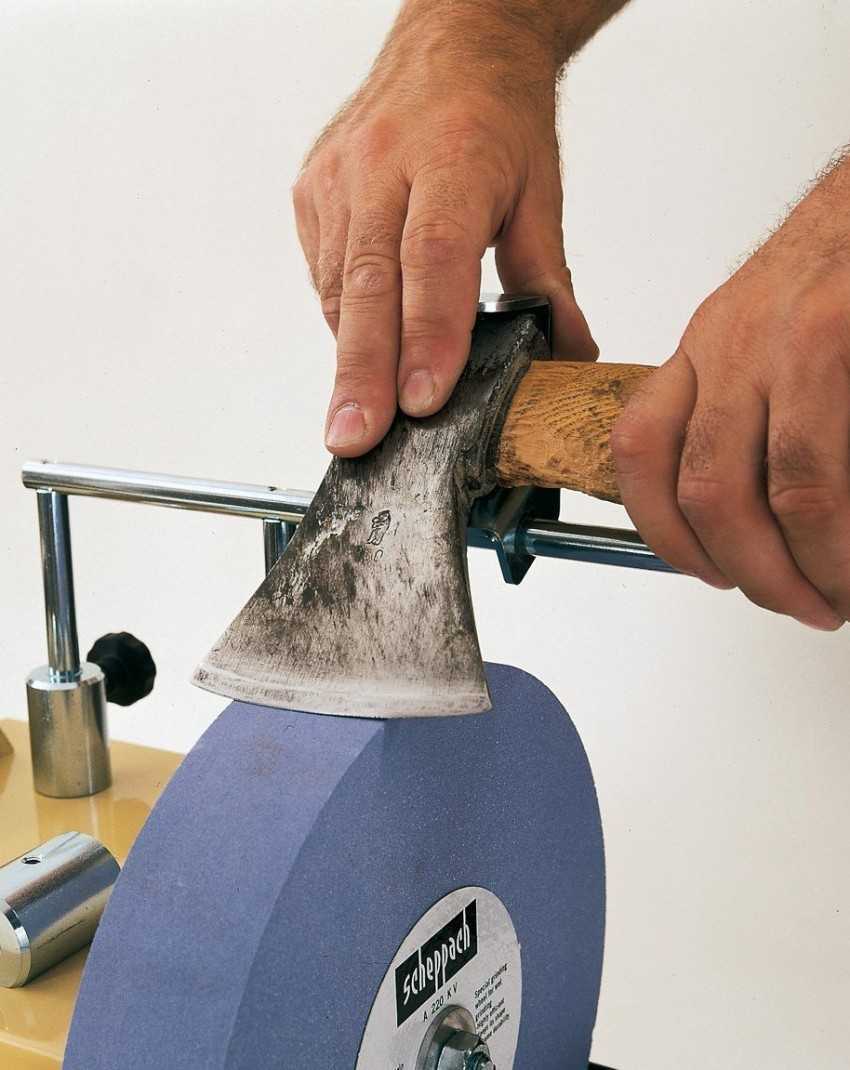 Заточка топора – дело простое. Берем болгарку с абразивным диском и стараемся выдержать угол в 20 градусов.