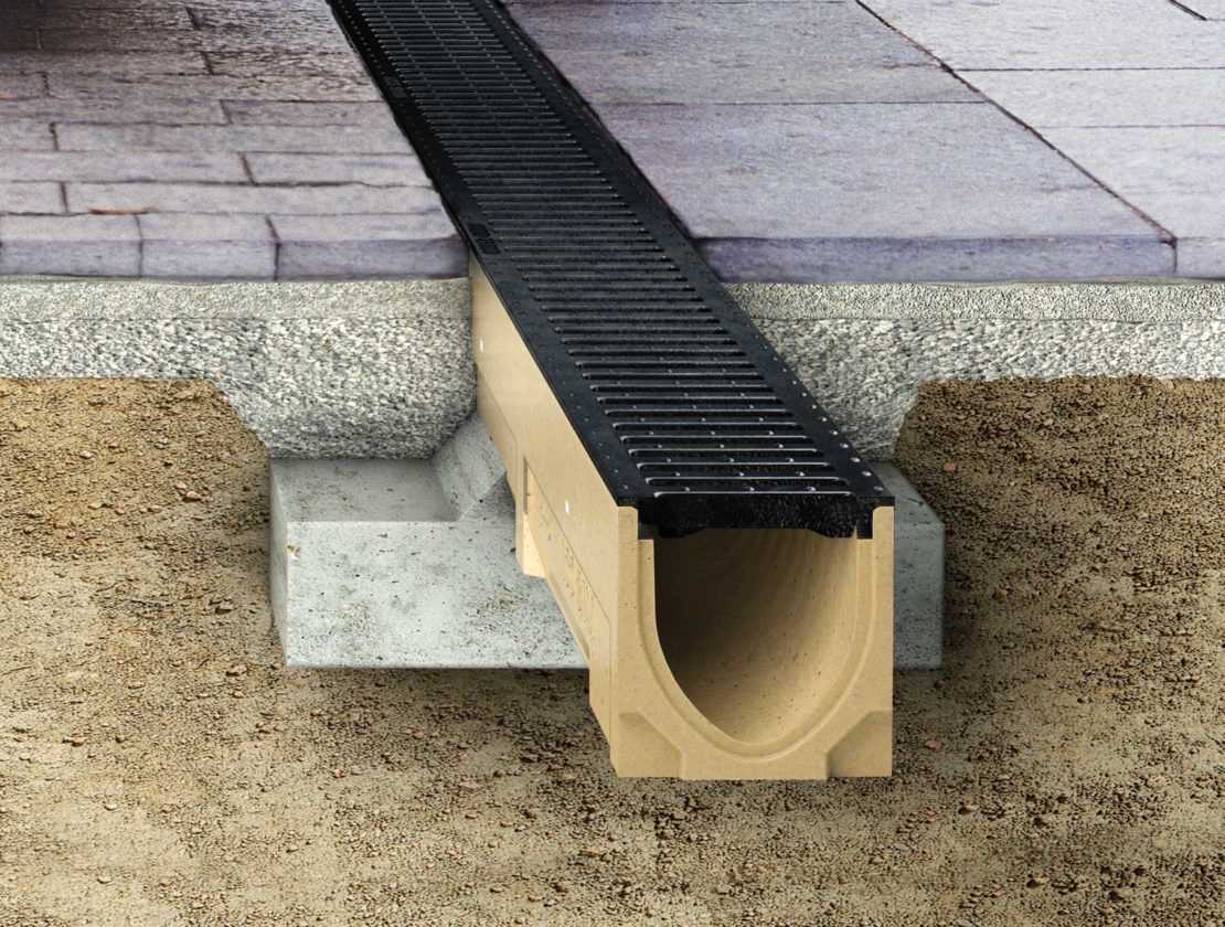 Система сбора поверхностной воды монтируется в траншеях глубиной не более 1,5 м. Чаще всего, глубина их не превышает 50–60 см. В них устанавливаются водосборники в виде дренажных лотков, в которые стекает вода с поверхности участка. Наибольшее распространение нашли полимерные лотки. Можно использовать металлические и железобетонные желоба. В самодельных системах нередко водосборник формируется путем заливки бетона в опалубку, установленную непосредственно в траншее.