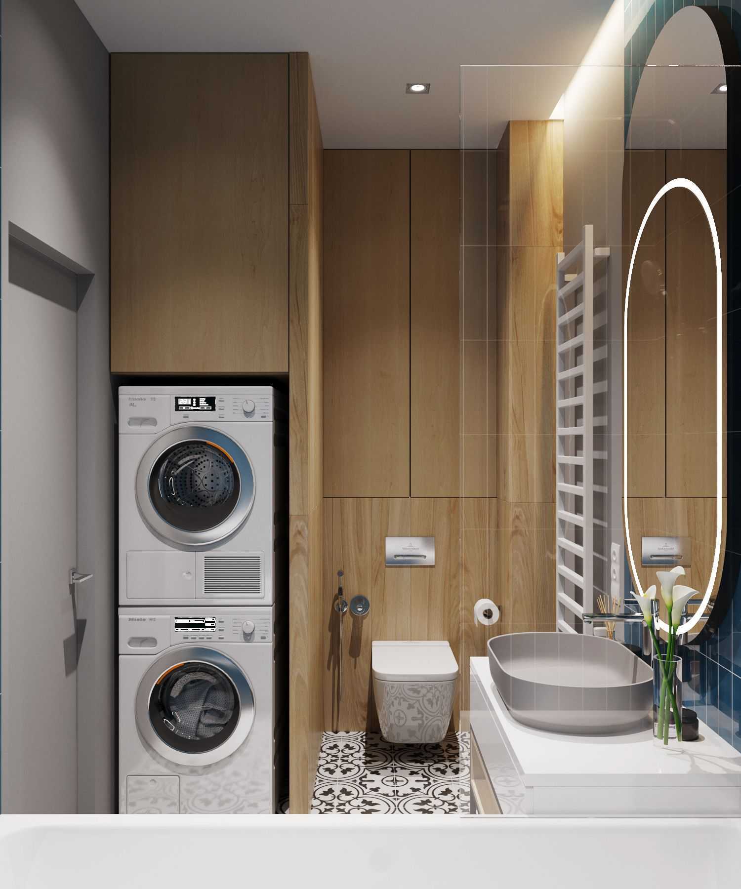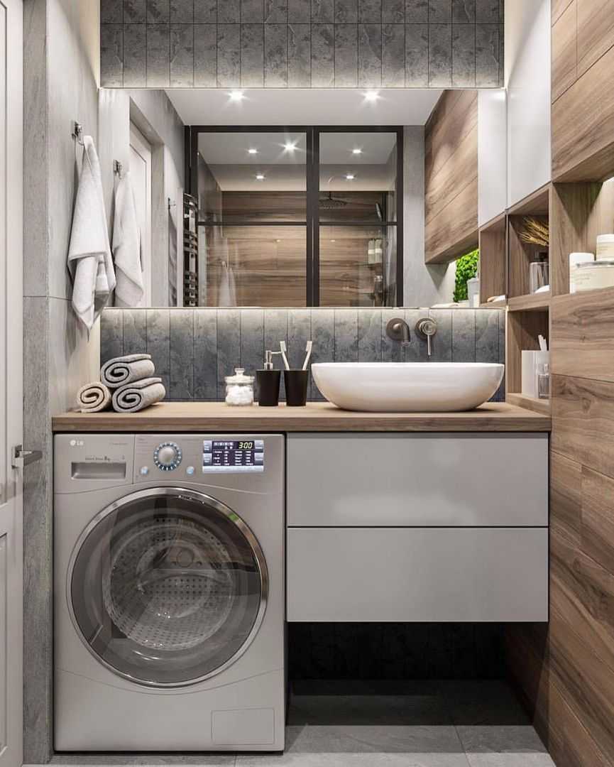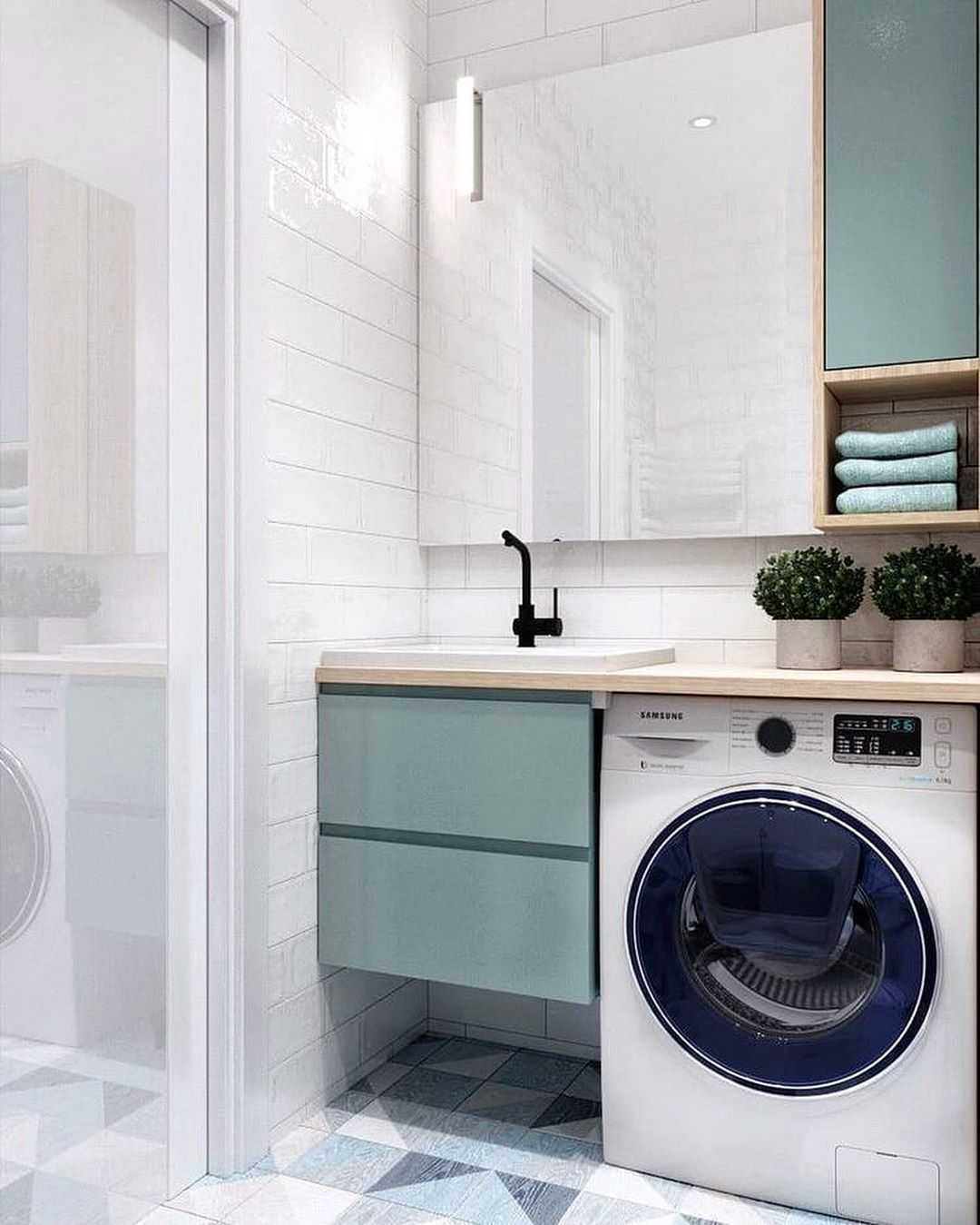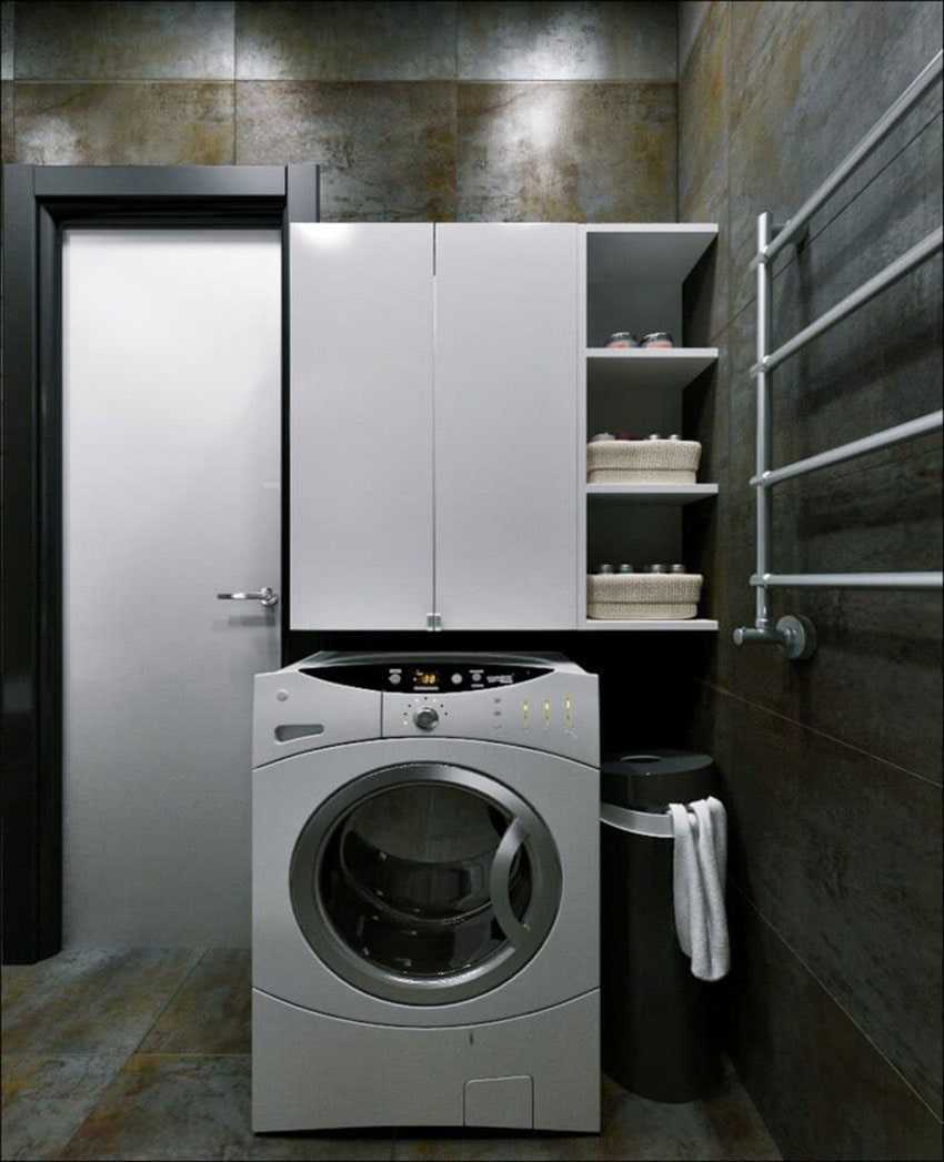 Когда не хватает места – ее можно разместить в задней части комнаты, в нише, или под столешницей раковины. Можно также встроить ее в тумбу или в другую мебель для ванной и закрыть мебельными фронтами, которые можно открывать на время стирки, при этом после стирки ее можно скрыть за дверцей.
