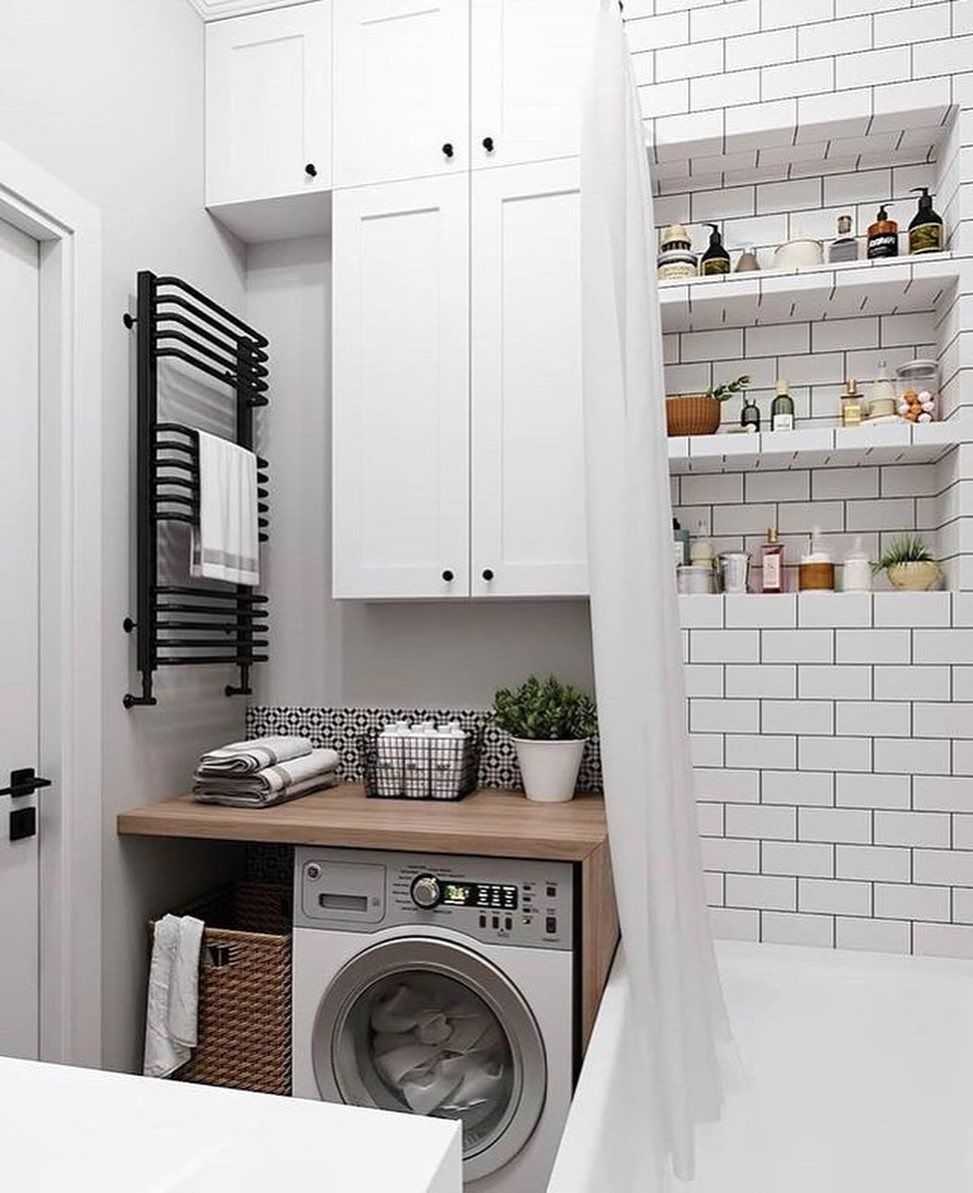 Если у нас есть ниша в ванной, то выделите ее полностью в уголок для прачечной. В дополнение к технике вы сможете там разместить все принадлежности, необходимые для стирки. Ниши легко создать и скрыть. Таким образом, вы сконструируете мини-пространство для прачечной.