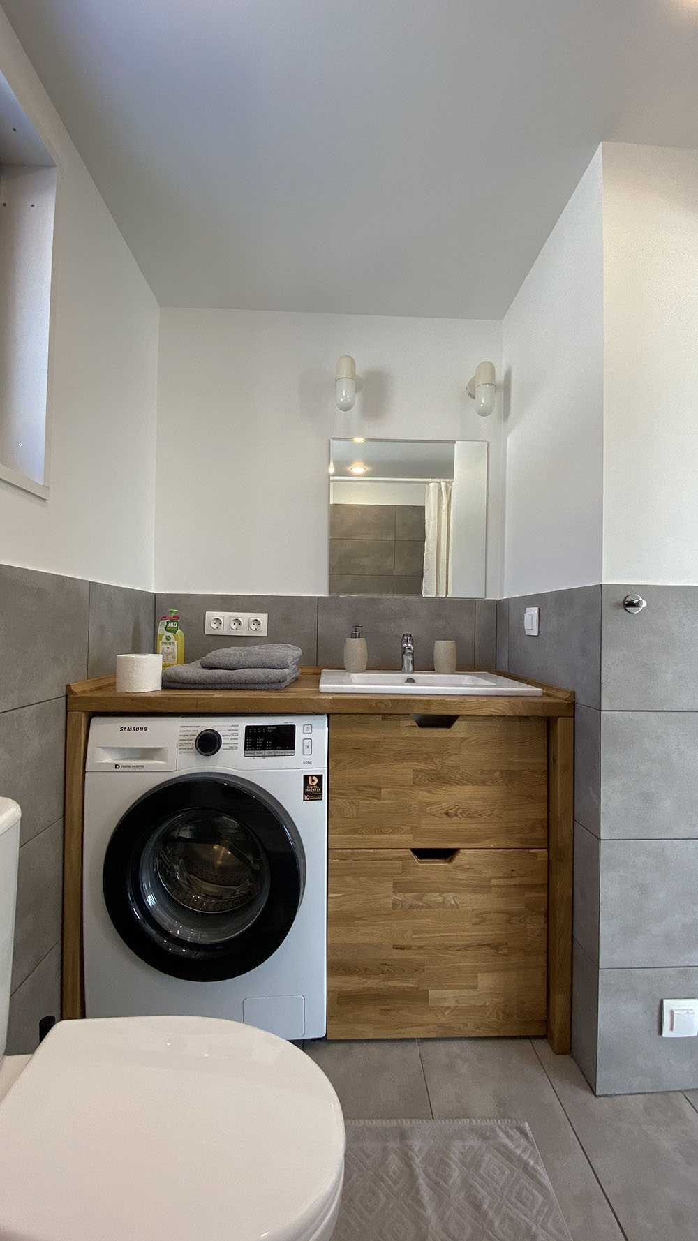 В маленькой ванной стиральная машина, как правило, остается видимой, но даже так мы можем планировать ее место так, чтобы она не мешала, и гарантированно была удобной в использовании. Вы можете встроить ее, например, только с одной стороны. Можно также создать или использовать существующую нишу. Достаточно того, что она будет иметь ширину немного большую, чем стиральная машина (около 65 см, при ширине машинки 60см). А над ней можно сделать полки или ниши, которые идеально подходят для хранения аксессуаров для стирки.