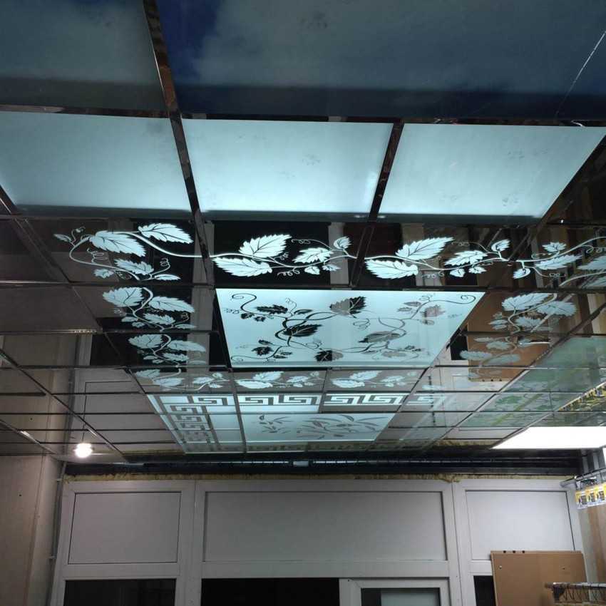 Шаг пятый: устанавливаем зеркальные плиты на потолок. Можно составить потолок из различных плит — некоторые предпочитают комбинировать глянцевые плиты с теми, на которых изображены узоры. Необходимо вставлять плиты в заранее подготовленные для них ячейки. Для того, чтобы не поранить кожу, лучше воспользоваться защитными перчатками. При необходимости зеркальные плиты можно быстро разделить с помощью стеклореза — в этом случае придется снова придерживаться мер безопасности. Желательно разложить плиты на ровную поверхность, а затем расчертить на них линии отреза