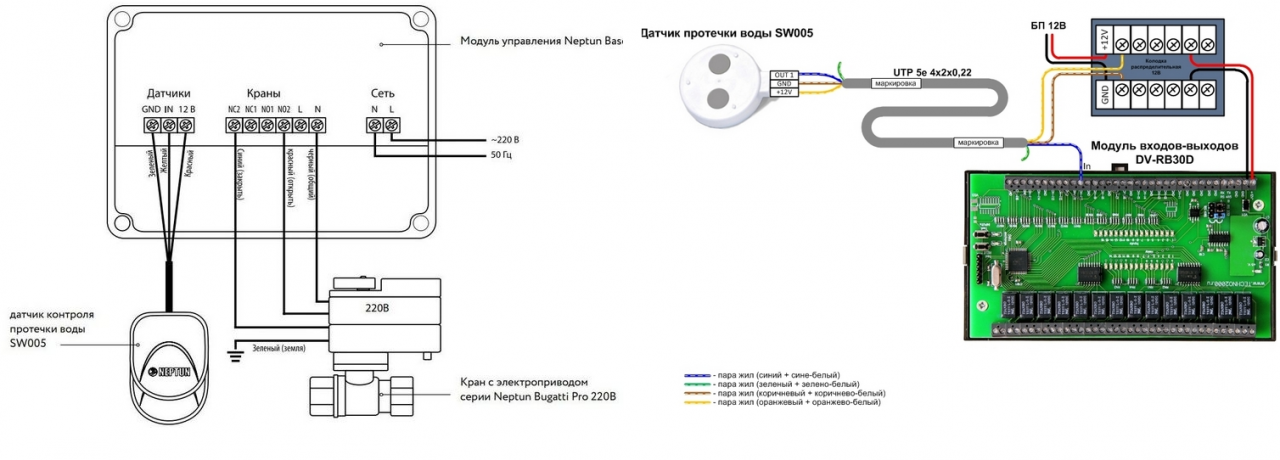 Как видно из приведенного выше принципа работы защиты от протечек воды, такой комплекс защиты включает в себя следующие базовые элементы: