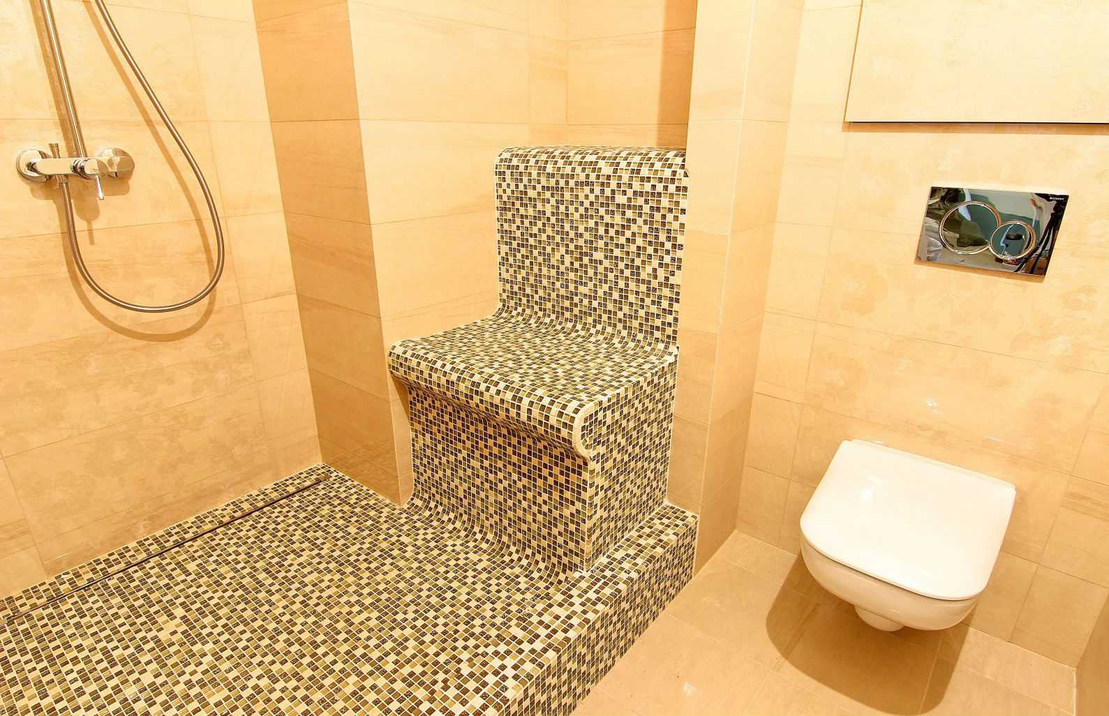 В некоторых моделях открытого типа поддон отсутствует, поэтому его следует сделать самостоятельно своими руками. В большинстве случаев возводится подиум из бетона с кафельной или мозаичной облицовкой на небольшом возвышении со сливным трапом. Процедура состоит из следующих этапов: