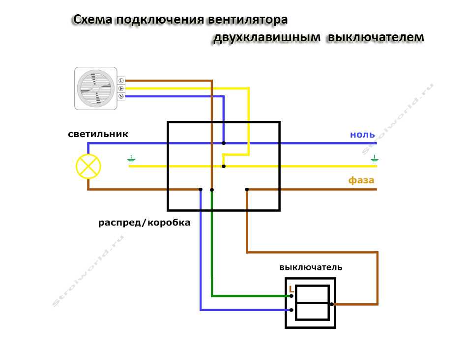 По сути, сама схема повторяет схему подключения лампочки, только вместо осветительного прибора — вентилятор. Все это можно вывести на двухклавишный переключатель, одна кнопка которого будет отвечать за свет, а другая — за вытяжку.