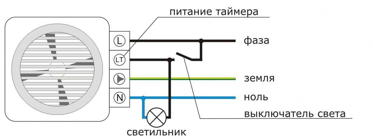 Чтобы правильно установить устройство своими руками с таймером потребуется четыре провода. Такой вентилятор имеет четыре контакта. Монтаж делается по следующей схеме подключения проводов: L — кабель с распаянной коробки, Lt – провод через выключатель освещения, N — «ноль» и четвертый – заземление в соответствующее гнездо на приборе.