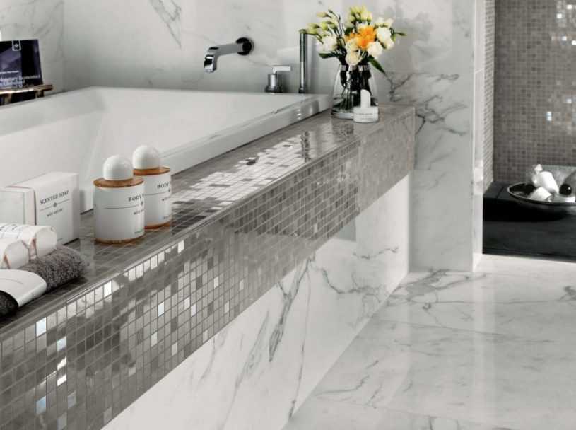 Несмотря на то что многие специалисты не советуют отдавать предпочтение плитке с зеркальным отражением, в ванной её использовать можно.