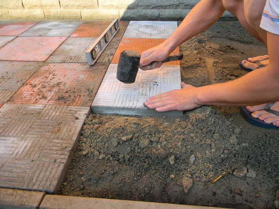 - Следующий шаг – укладка керамогранита и постукивание по изделиям резиновым молотком. Между ними необходимо проставлять отделяющие крестики.