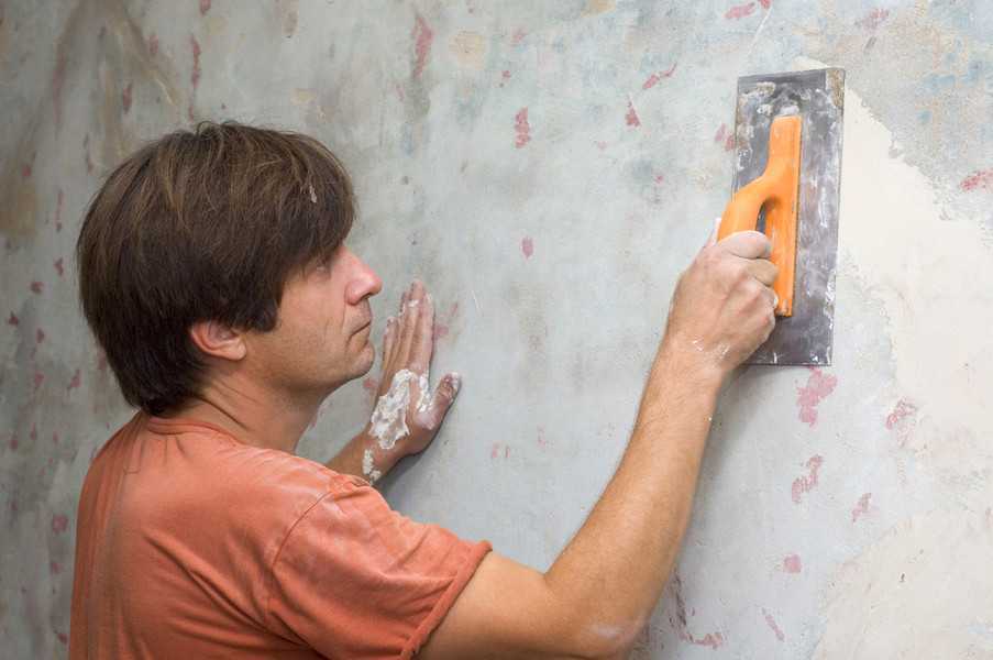 Работа по выравниванию стен начинается с демонтажа старого покрытия. Кафель сбивается, краска или обои снимаются. Счищать все нужно до бетонного основания. За счет этого штукатурка будет прочно держаться на поверхности.