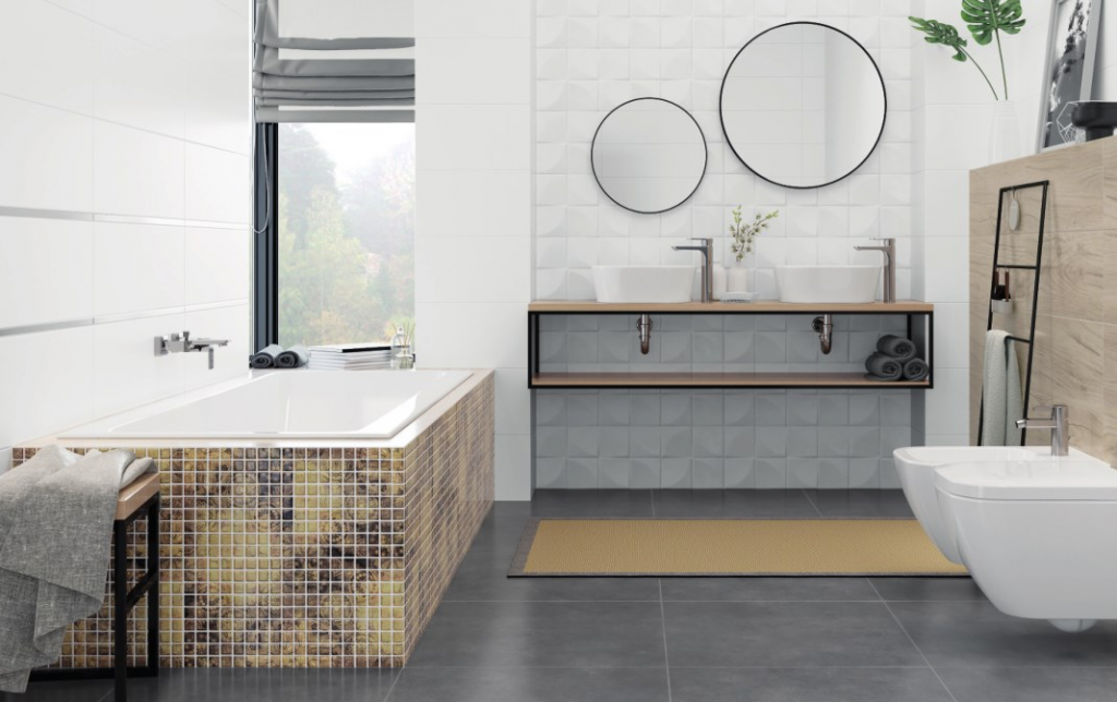 Выбирая плитку для ванной комнаты, нужно помнить, что в помещениях с небольшой площадью на стенах лучше смотрится плитка небольших размеров.