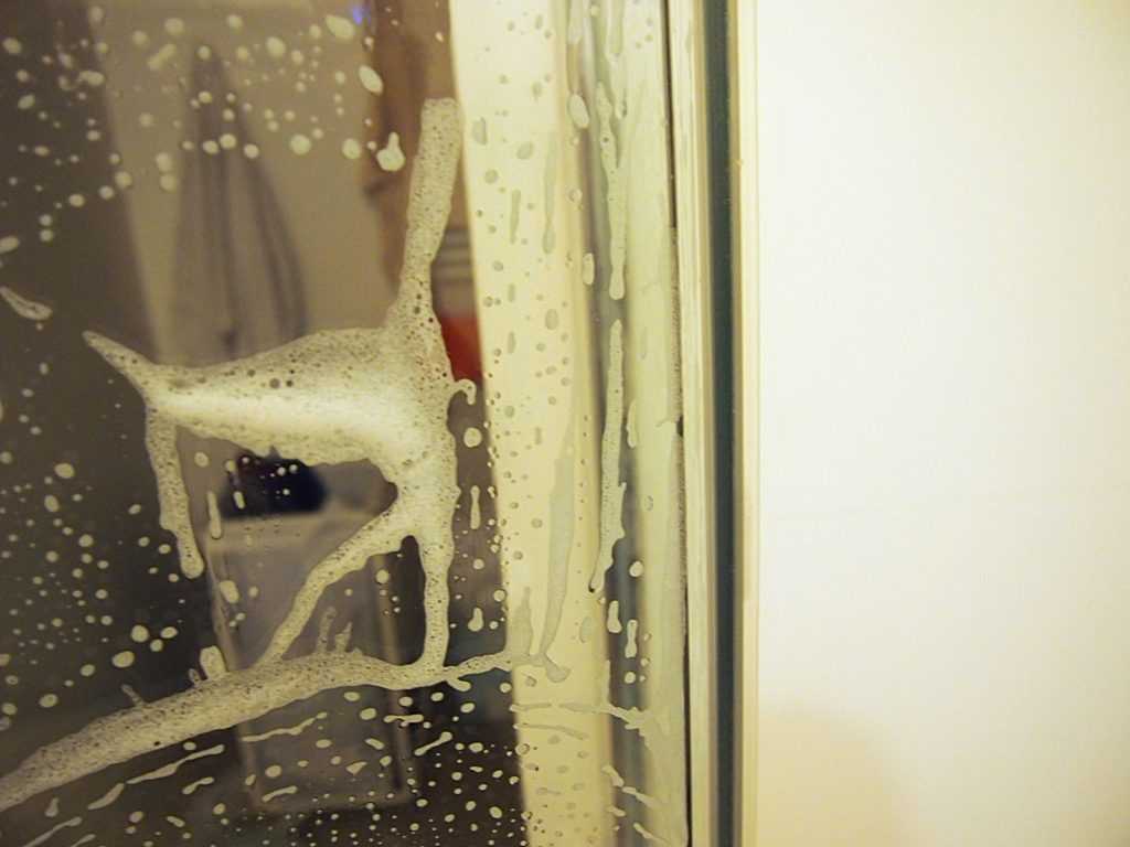 Раствор спирта с водой (1:3) эффективно удаляет налет со стеклянной и хромированной поверхности. Смесь залить в пульверизатор, обрызгать поверхность кабинки. Протереть сухой салфеткой.