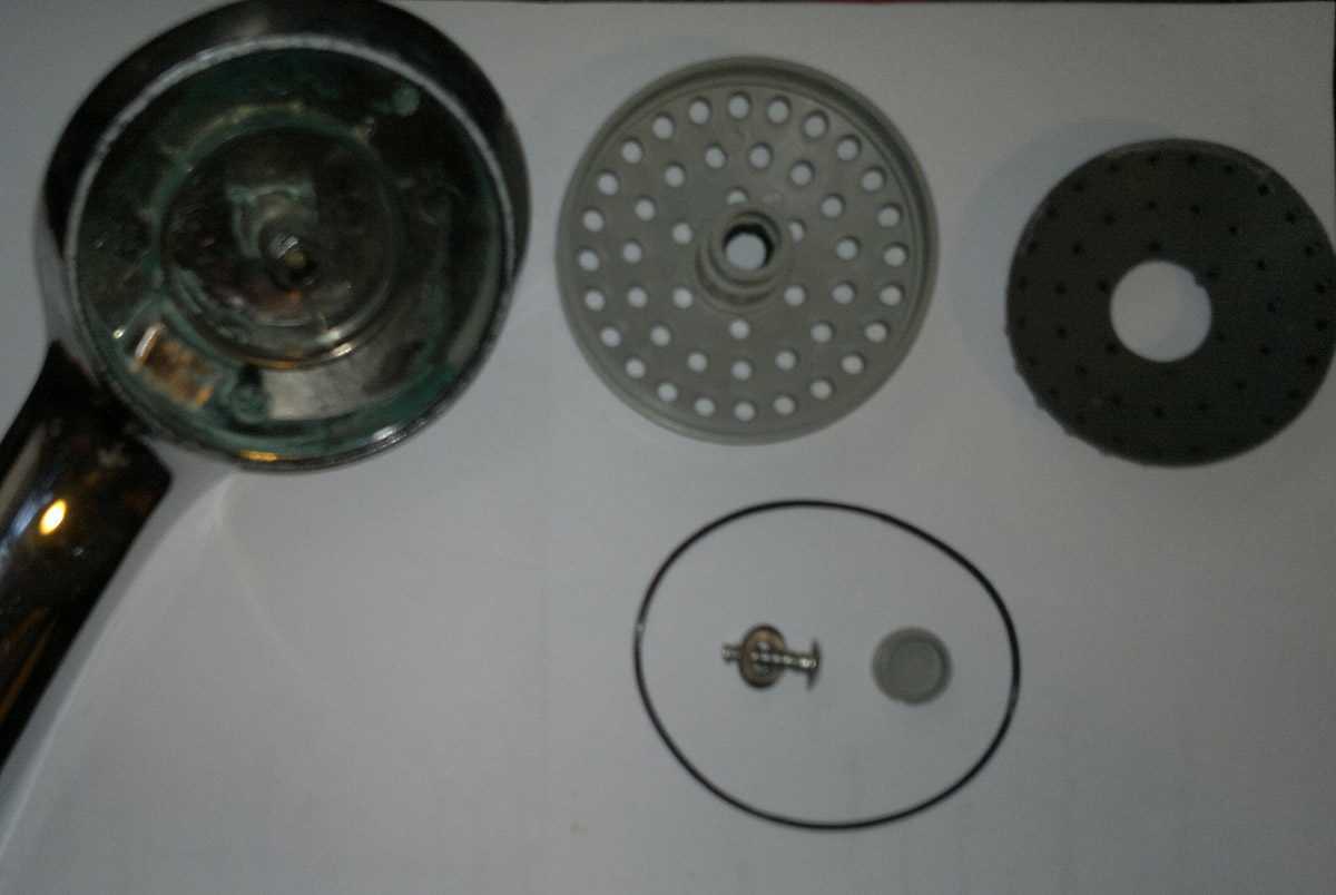 После окончательной разборки можно приступать к механической чистке, которая включает в себя прочистку тонких сеточек с помощью щётки и удаление возможных нерастворимых частиц с корпуса и форсунок душевой лейки.