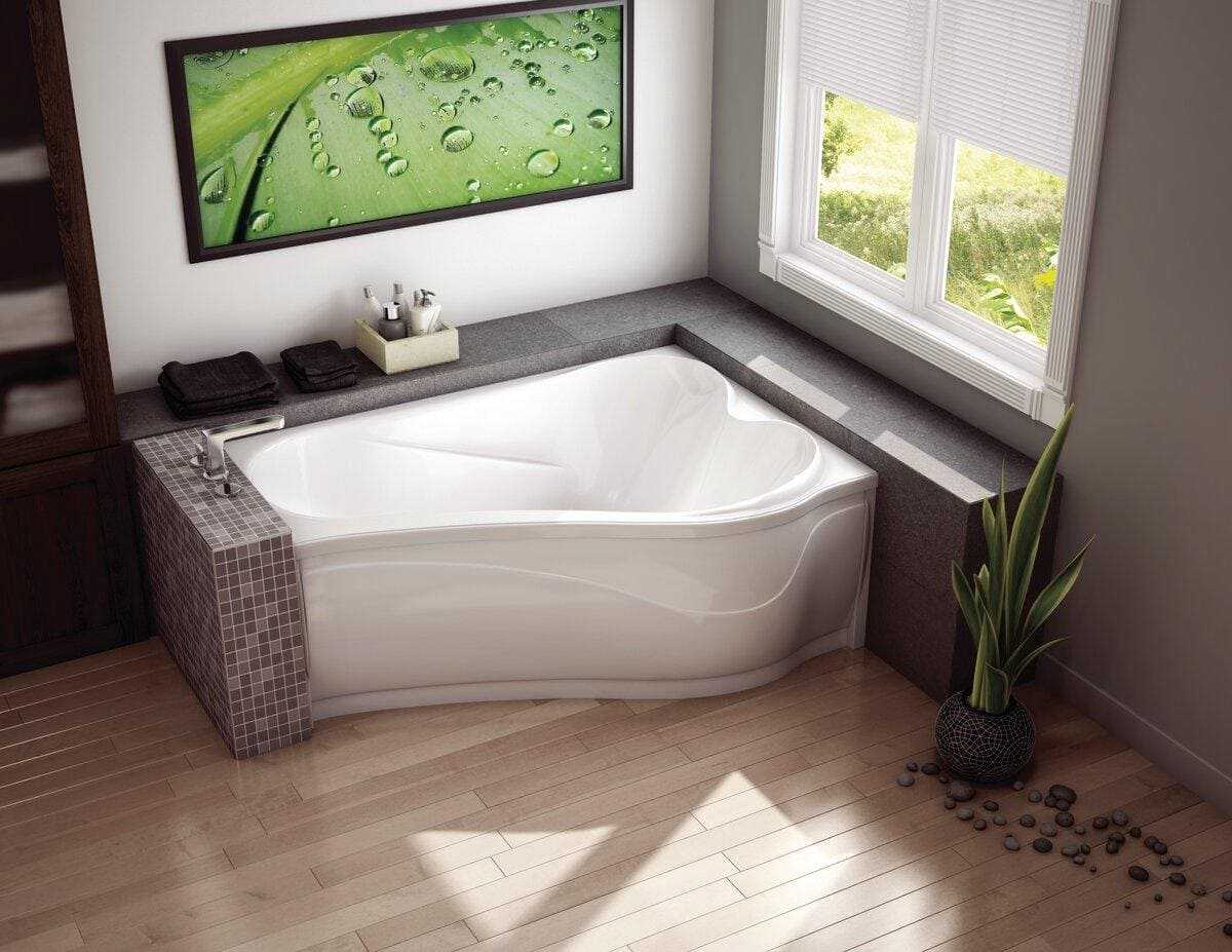 Еще один популярный среди покупателей тип геометрии ванн – угловой. Топологически такой объект идентичен прямоугольному треугольнику, у которого катеты примыкают к стенам, а гипотенуза имеет неровную выпуклую форму.