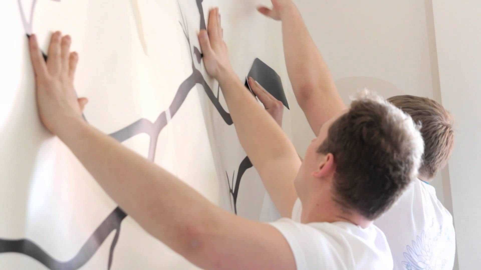- Большую наклейку приложите подложкой к стене и аккуратно отделите небольшую ее часть. Приклейте этот край, прижмите и аккуратно вытягивайте подложку, одновременно прижимая освободившиеся части наклейки (вот где четыре руки просто необходимы!). Разглаживайте наклейку от центра к краям. Не торопитесь