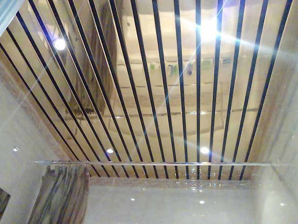 Потолок можно окрасить жемчужно белой или бежевой краской. Установленные точечные светильники помогут выделить функциональные зоны ванной. Для визуального расширения или уменьшения пространства используются фактурные потолки. Как правило, это зеркальные поверхности, глянцевые натяжные полотна или реечные конструкции