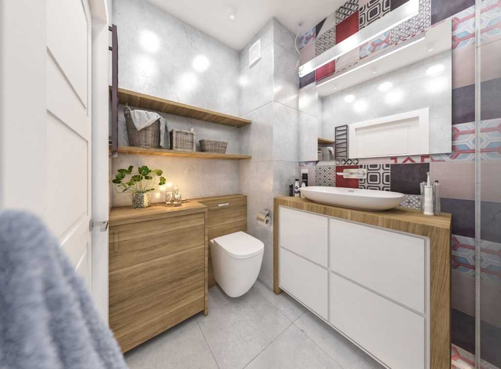 Очень красиво будет смотреться сочетание белого и древесного цвета. Этот тренд пришел из эко-дизайна. Такое украшение убирает ощущение стерильности, которое может появиться в чисто белой ванной.