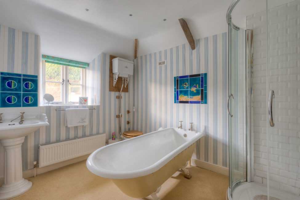 Натуральная отделка раскроется в габаритной ванной, при этом будет незаметной в крохотной. Чтобы комната не выглядела помпезно, облицовку часто комбинируют с другими материалами. Например, с декоративной штукатуркой, окрашиванием или обоями. Частичная отделка поможет расставить акценты или визуально изменить неправильную форму санузла.