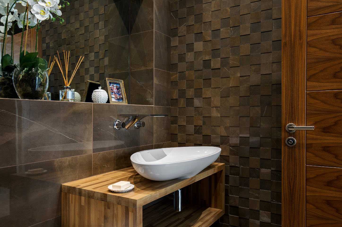 Чтобы придать ванной комнате уюта и теплоты, стоит обратить внимание на натуральные оттенки дерева или кофейно-коричневую палитру. Такой выбор идеально подойдёт для ванной, что облицована кафелем. Если кафель в ванной строгий и холодный, то изделие из дерева будет выглядеть в ней эффектно и стильно