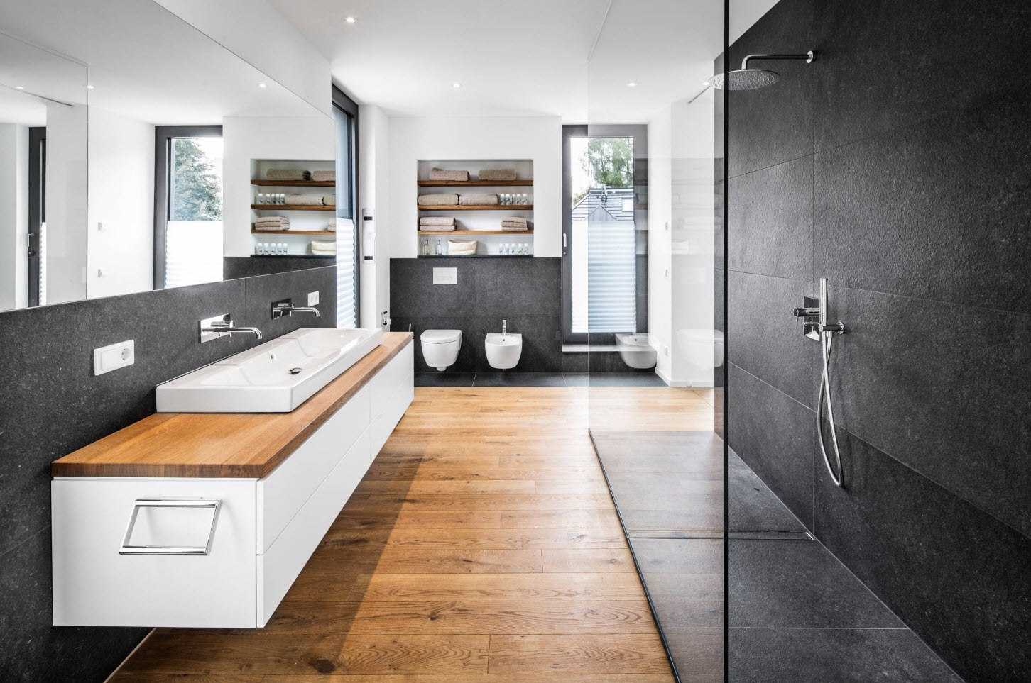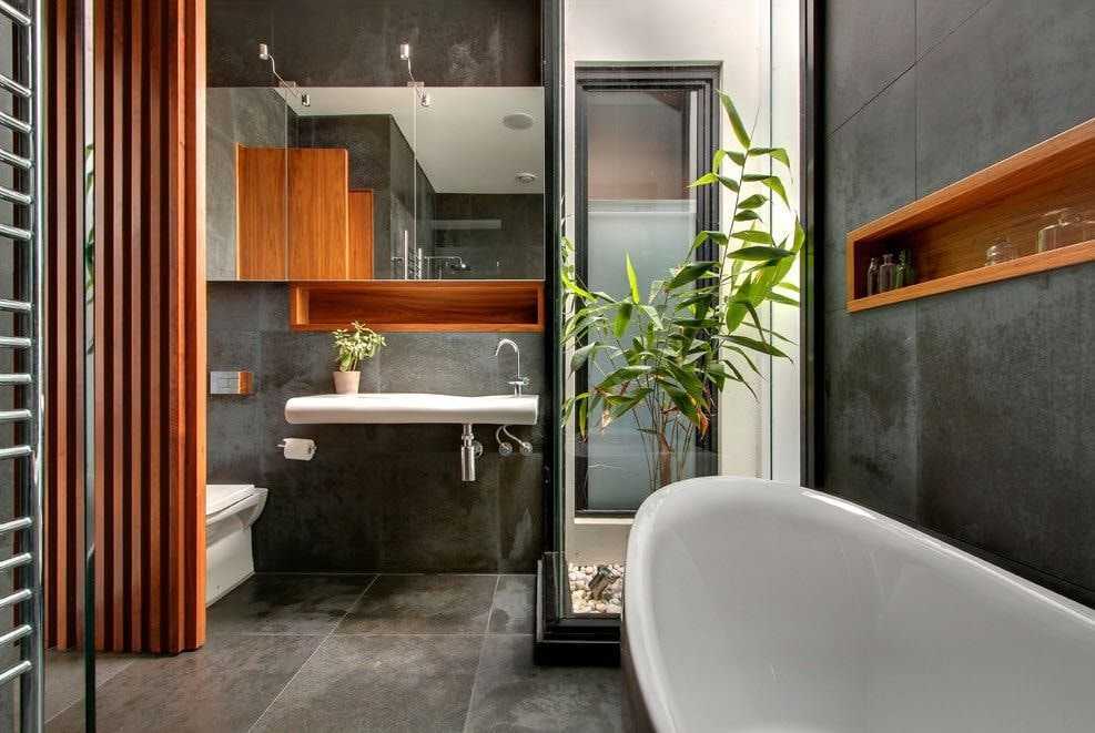 В корпусе ванны — современное решение для большой комнаты с отдельно стоящей чашей для купания позволит вам применять сантехнику в качестве места, где можно разместить шампунь, гель для купания.