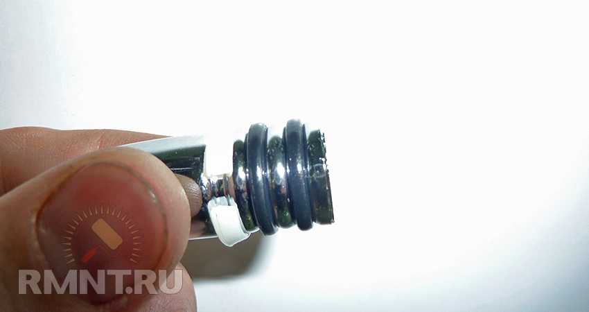 , тогда вода синхронно поступает в положение «душ» и «излив». Необходимо отключить излив, ввести стержень с шестью гранями в переходник. Потом аккуратно его снять, придерживая при этом угольник. Далее с помощью штока выталкивается клапан. Если кольца стали хрупкими или по ним пошла эрозия, то необходимо их заменить на новые.