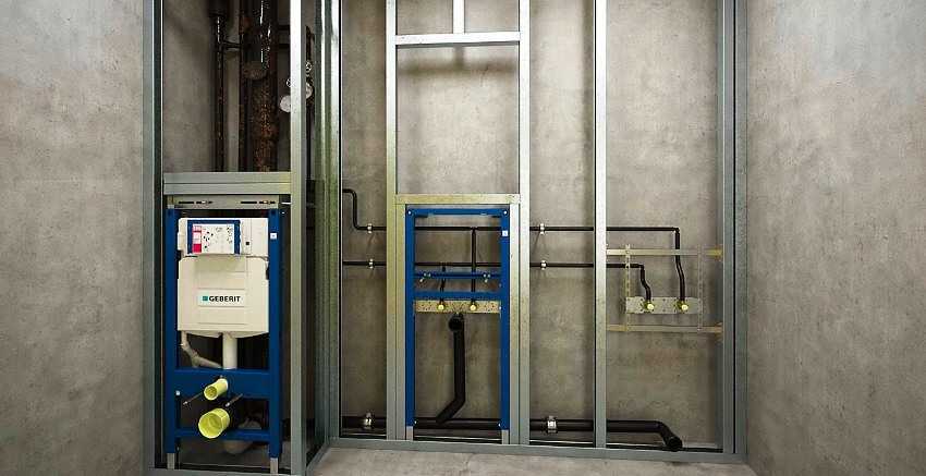 Размеры санузла определяют тип и габариты каркаса. Так, для небольшого помещения с капитальной стеной подойдет блочная консоль, если несущих стен в комнате нет, выбирают рамную.