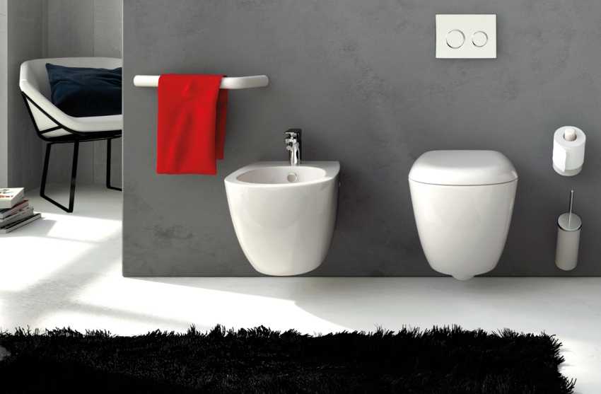 Навесной или консольный унитаз позволяет визуально увеличить пространство помещения, хотя говорить о том, что он значительно компактнее напольного, некорректно. В таком туалете на виду пользователя лишь чаша унитаза, встроенная в стену, и кнопка слива. Чаша и прочие коммуникации устанавливаются на металлическую раму, называемую инсталляцией, которая скрывается за фальшпанелью. Организация последних также «съедает» полезную площадь туалета. Впрочем, за счет встраиваемой чаши освобождается пространство под полом, и вся конструкция смотрится менее громоздкой из-за отсутствия в поле зрения бачка. Параметры настенного подвесного унитаза варьируются у разных производителей. В среднем они имеют ширину 35-37 см, длину – от 48 до 58 см, высоту – 42 см.