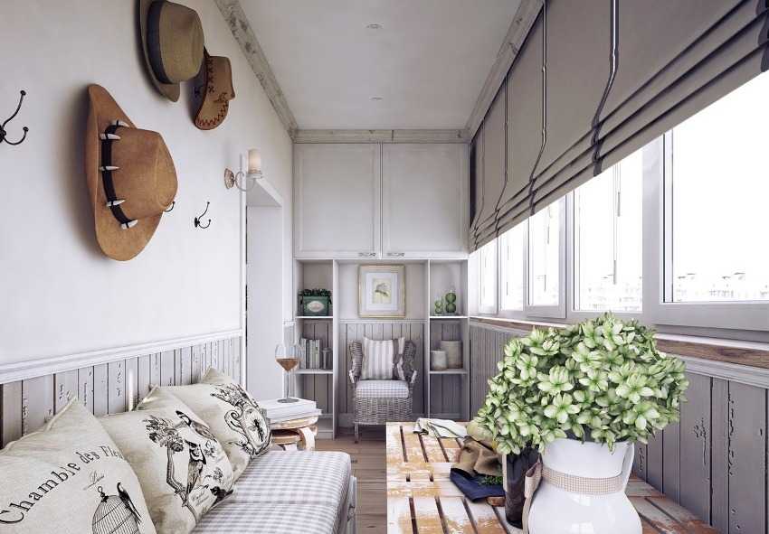 На балконе или лоджии не нужно устанавливать перегородки, следует оставить помещение максимально открытым. Под окнами нужно выполнить настоящую кирпичную кладку, которая будет красиво смотреться и при этом не займет лишнее пространство. Рекомендуют отдать предпочтение светлому кирпичу. Окна лучше выбрать деревянные в темном цвете. Допускается использование металлопластика, имитирующего текстуру дерева.