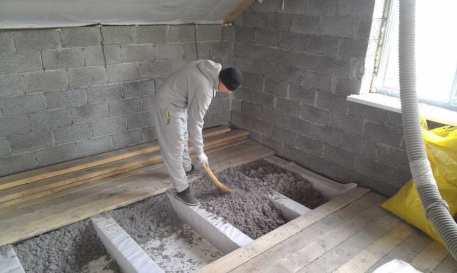 Свободное пространство нужно засыпать керамзитом. Если таковой уже имеется, то вполне можно его оставить. Раньше любили укладывать стекловату. Вот от нее надо избавляться в любом случае и заменить на керамзит. Слой керамзита выравнивается правилом, он должен быть на два сантиметра ниже уровня лаг.