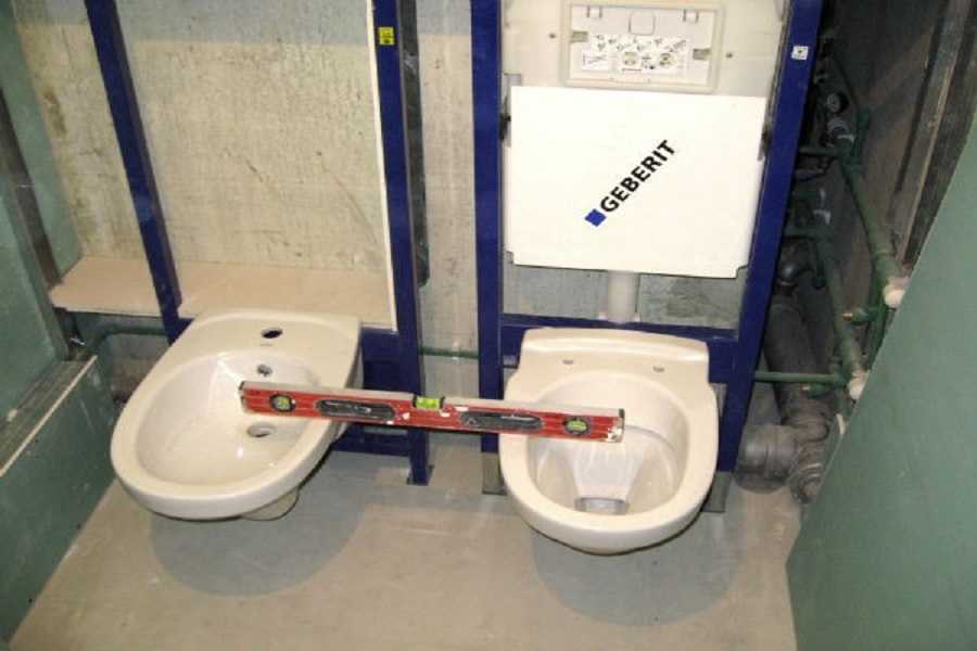 - Установить раму в желаемое положение, контролируя горизонтальность и вертикальность, соответственно, уровнем и отвесом. Ножки нужно отрегулировать так, чтобы биде располагалось на высоте примерно 40 см.