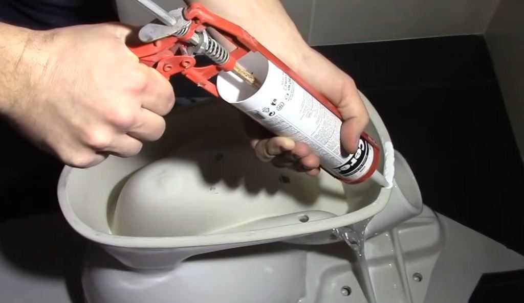 - Отсоедините прибор от канализации, переверните чашу. Нанесите клей на края подошвы.