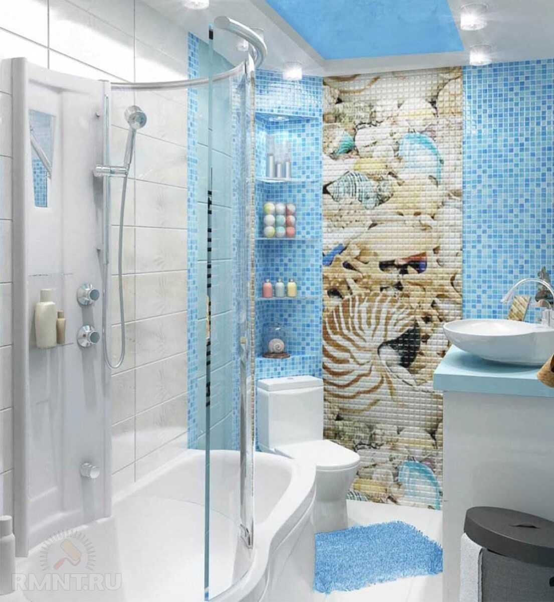 Важно выдерживать общий стиль во время ремонта, не перегружая дизайн. На стенах в ванной мозаика в морском стиле