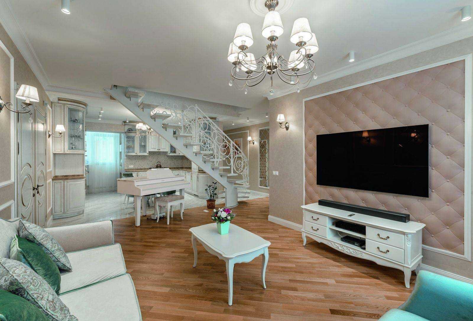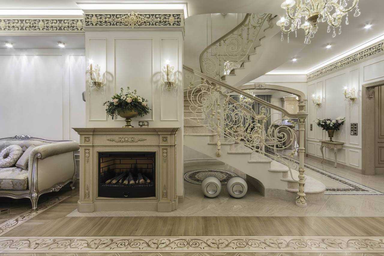 Роскошная и одновременно строгая классика предполагает сдержанную оттеночную гамму и дорогие, изысканные элементы декора. В аксессуарах и мебельной фурнитуре присутствуют плавные линии и необычные формы. Для украшения фасадов и лестничных перил применяют резьбу и красивые узоры. Обстановку дополняют торшерами и люстрами со стеклянными или зеркальными деталями.