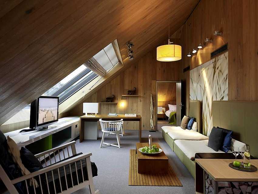 Такое помещение является комнатой, у которой стены и потолок – это элементы крыши здания. Чаще всего такое помещение занимает все чердачное пространство, но иногда им заполняют только часть чердака.