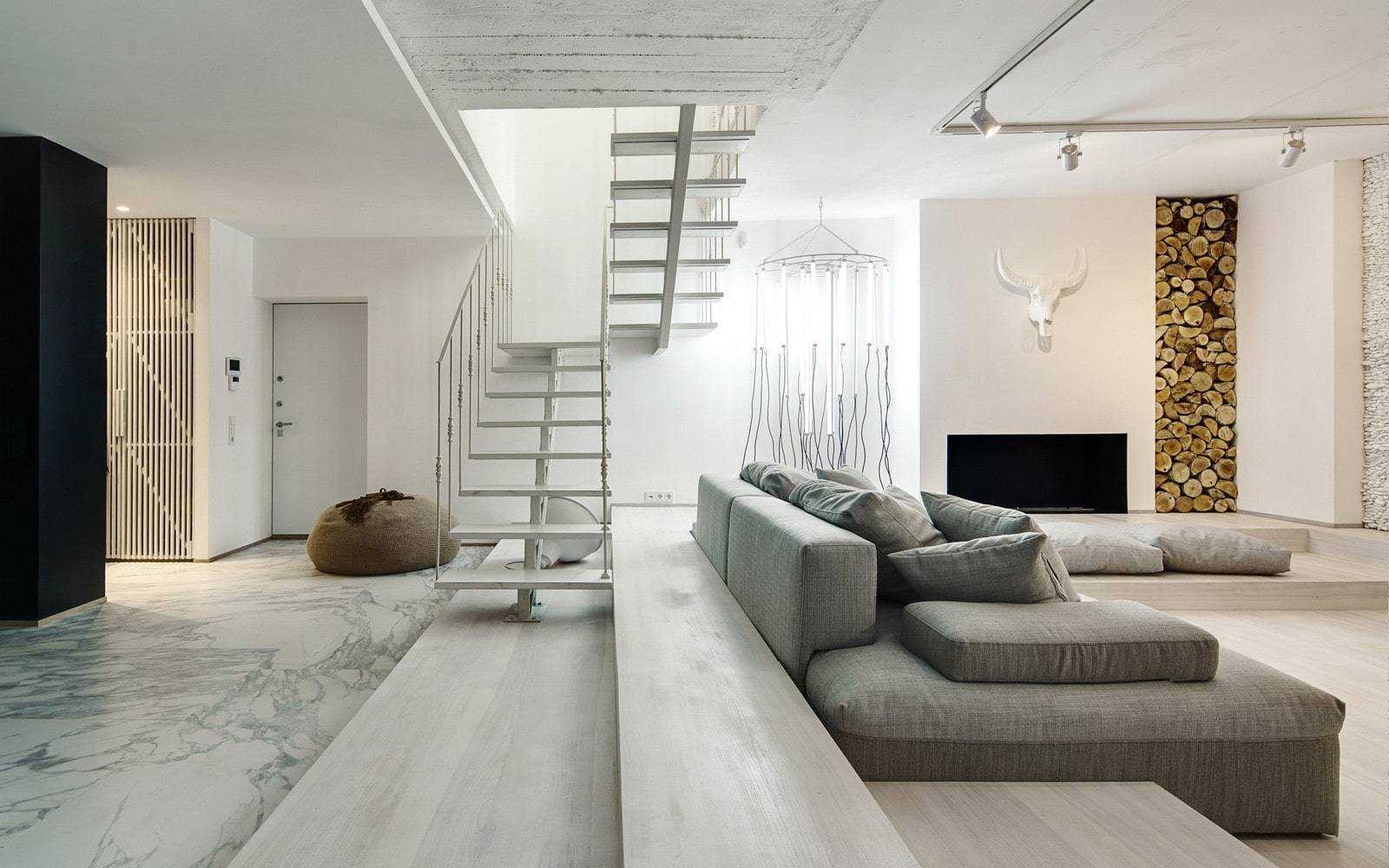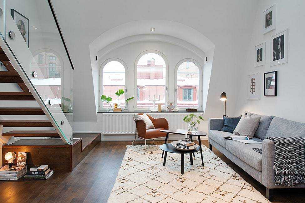 На фото интерьер двухуровневой квартиры в скандинавской стилистике.